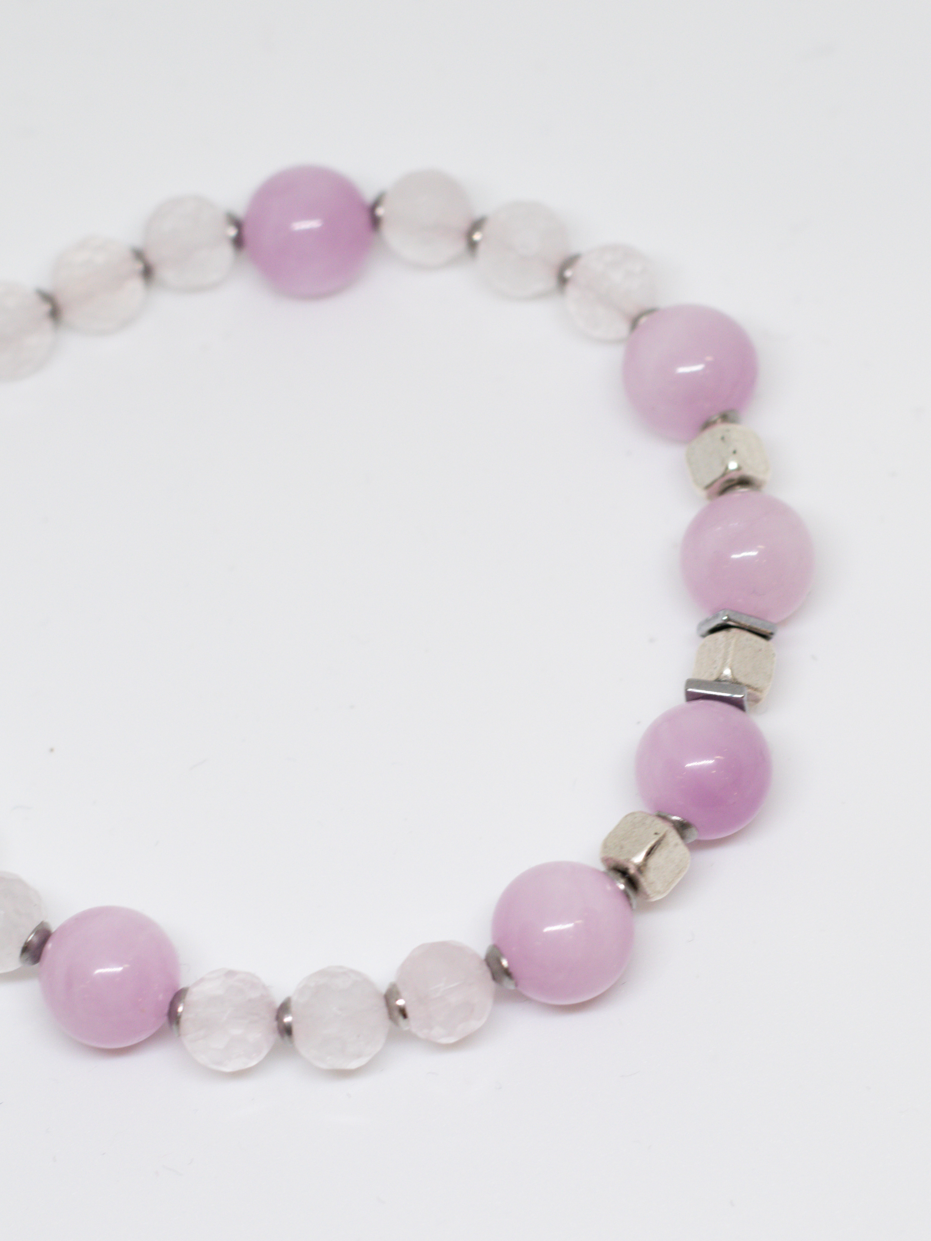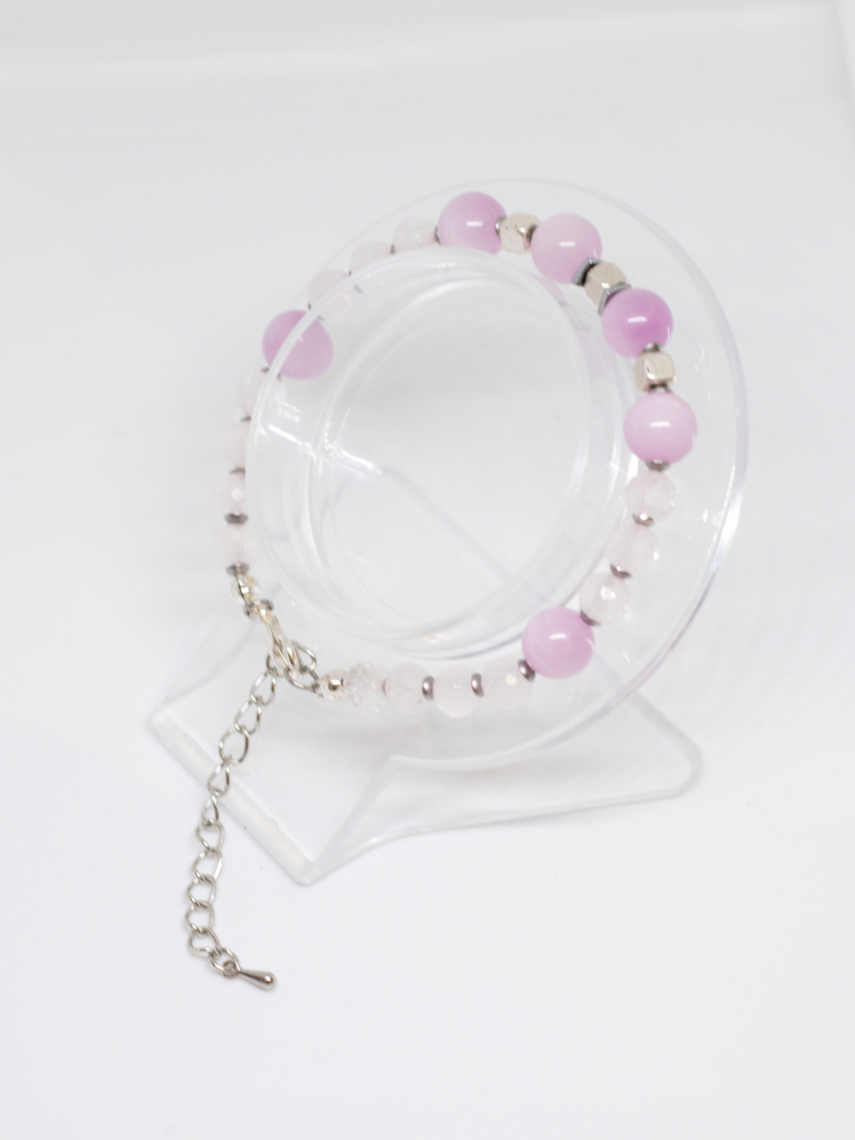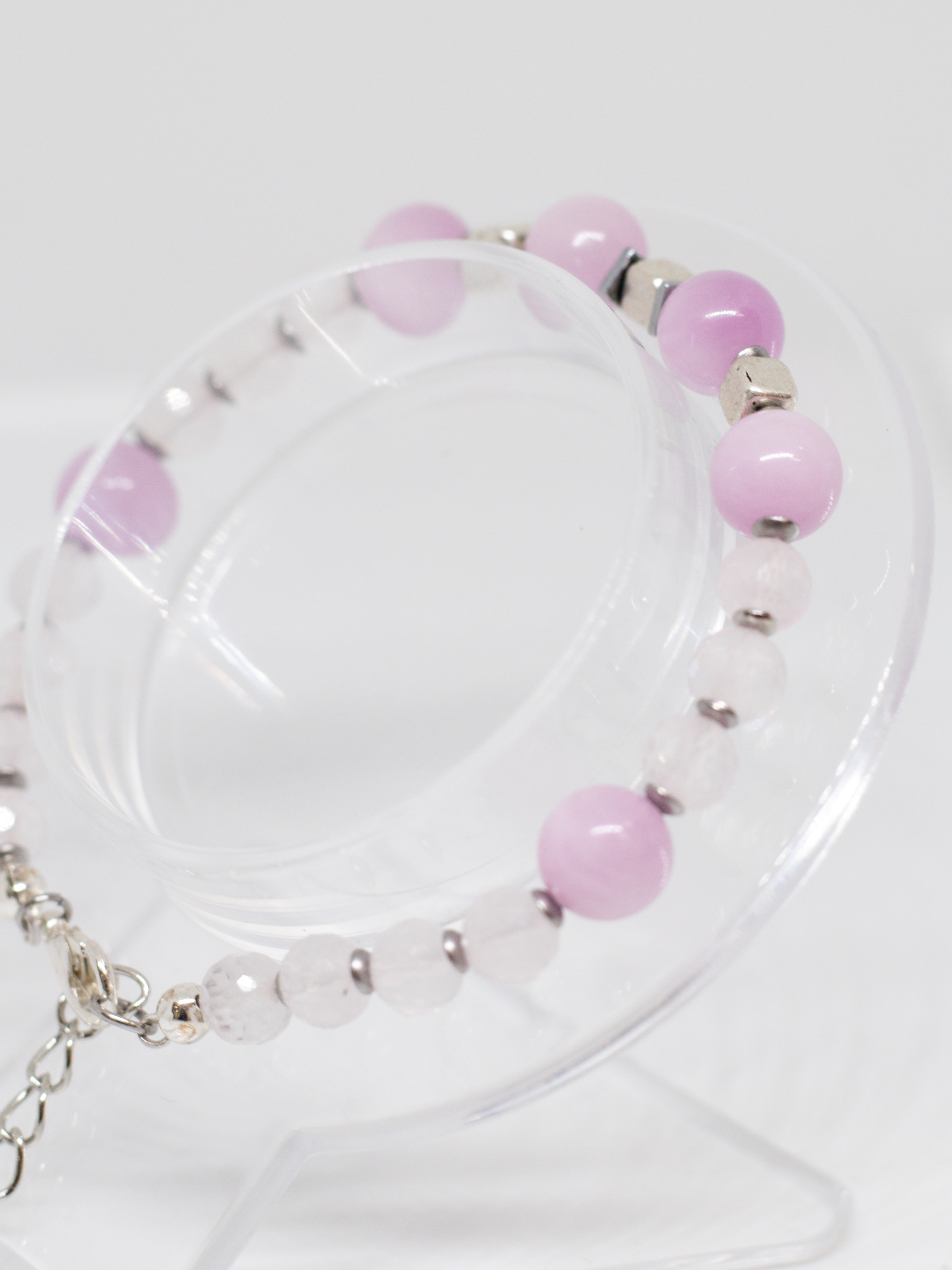 Розовые и прозрачные оттенки камней напоминают о теплых летних днях, цветочных лугах и безмятежном отдыхе на природе. Легкий, воздушный, будто сотканный из облаков браслет, дарит ощущение невесомости, комфорта и беззаботности.