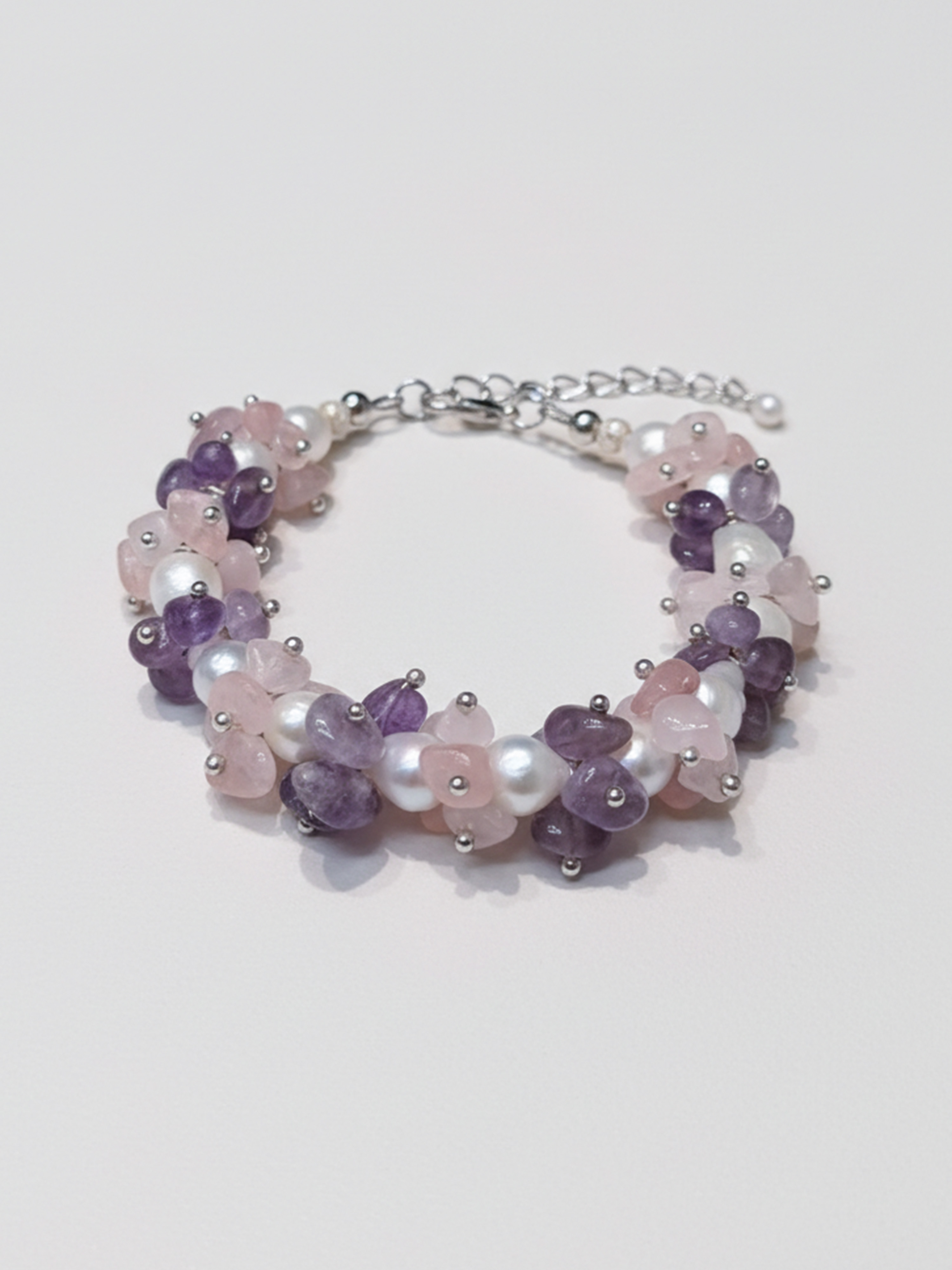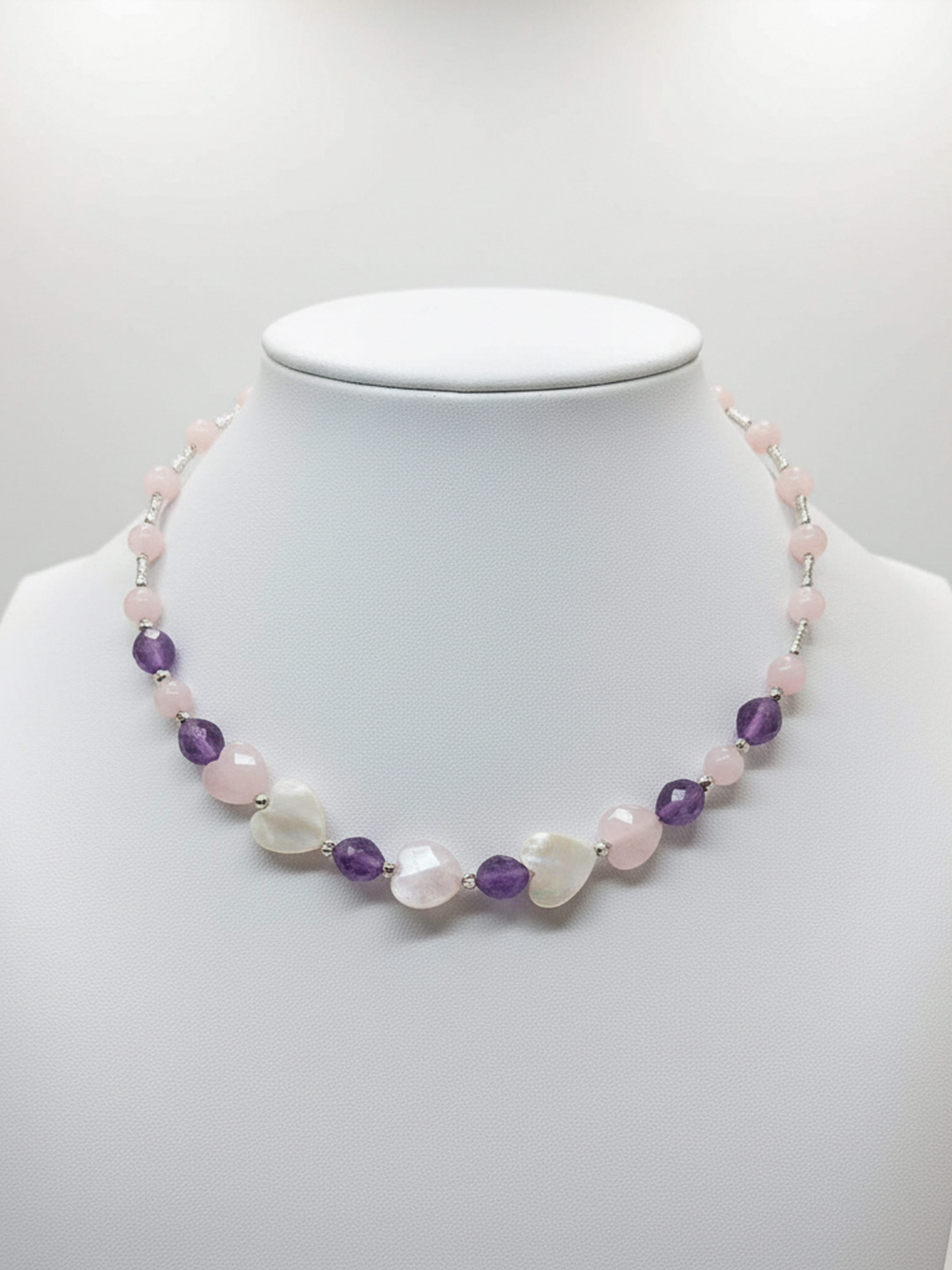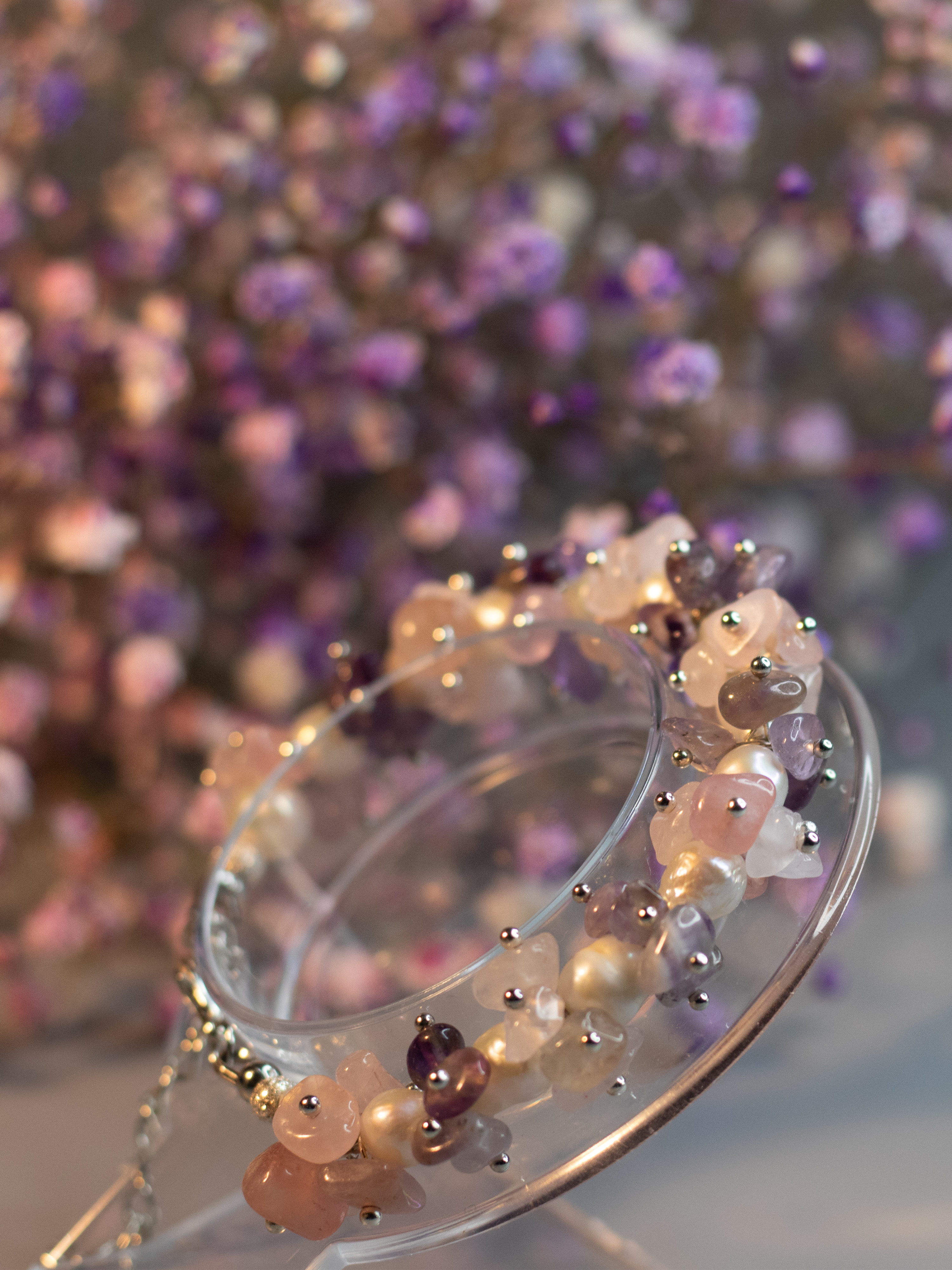 Мечты о любви и счастье. Предвкушение неизведанного и прекрасного. Камни, переливаясь на свету, словно уносят в загадочные дали, где царит волшебство и вдохновение. Это украшение, из аметиста, розового кварца и перламутра, для романтичных, нежных натур, которое олицетворяет юность и красоту, легкость и изящество.